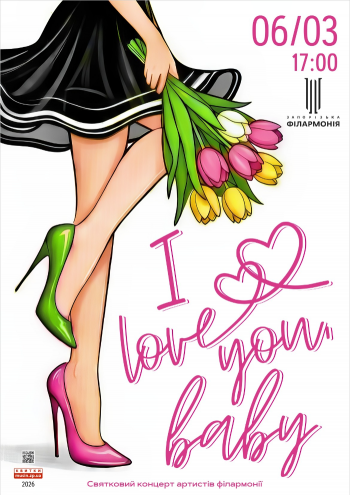 Свято ніжності та натхнення до Міжнародного жіночого дня! Артисти філармонії запрошують на святковий концерт «I love you baby», що подарує весняний настрій, тепло й відчуття особливої уваги до кожної жінки. У програмі — витончені музичні образи, чуттєві ритми та яскраві інтонації, що створять атмосферу легкості й радості, а популярна класика, джазові композиції та улюблені естрадні хіти захоплять своїм шармом. «I love you baby» — це вечір, коли музика стає найкращим подарунком. Відчуйте красу миті, насолодіться святом і здійсніть хоча б одну свою мрію разом із нами.