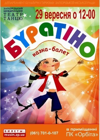 29 вересня у Запорізькому муніципальному театрі танцю відбудеться казка-балет «Буратіно». Початок вистави о 12:00.