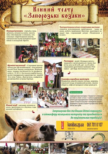 · театралізована кінна вистава - трюки на конях, бойові вправи зі списами, шаблями та батогом, старовинний ритуал «Посвячення у козаки», козацький гумор,
