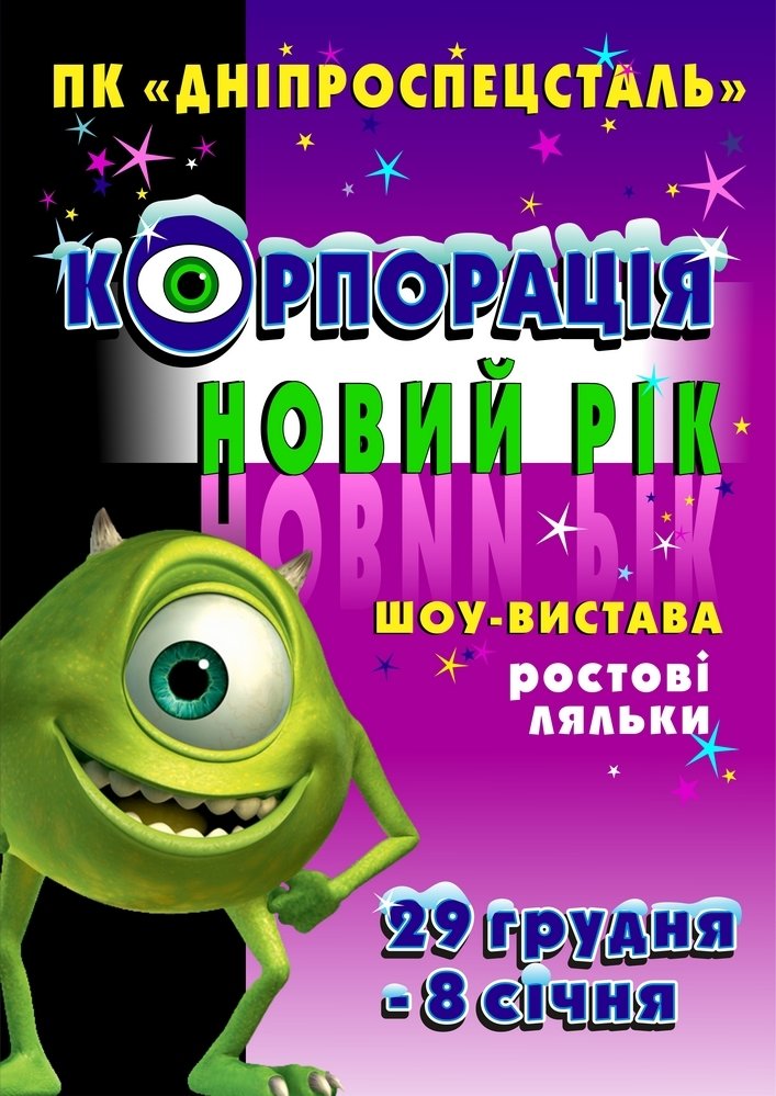 Приключенческое новогоднее представление готовит команда волшебников ДК «Днепроспецсталь». «Корпорация Новый год» - это волшебная история о сестрах – близняшках, которые попали в невероятные приключения. Распутать череду загадочных событий сможет только настоящий герой, непревзойденный Майк Вазовский, которого ждут захватывающие приключения, неожиданные встречи, путешествие в космосе и многое другое. Чем все закончится и кто поможет Майку создать свою корпорацию смогут узнать только наши маленькие зрители! Сюжет спектакля построен по мотивам популярного мультфильма "Корпорация Монстров". Ростовые куклы, масштабные декорации, новейшие технологии, свето-видеографика, а также, не имеющая аналогов в Запорожье 7-и метровая, живая, вращающаяся Новогодняя елка, интерактивные игры с Дедом Морозом и праздничная дискотека! Программа рассчитана на детей от 3-х до 14-и лет. Все это - только в ДК «ДНЕПРОСПЕЦСТАЛЬ»!!!
