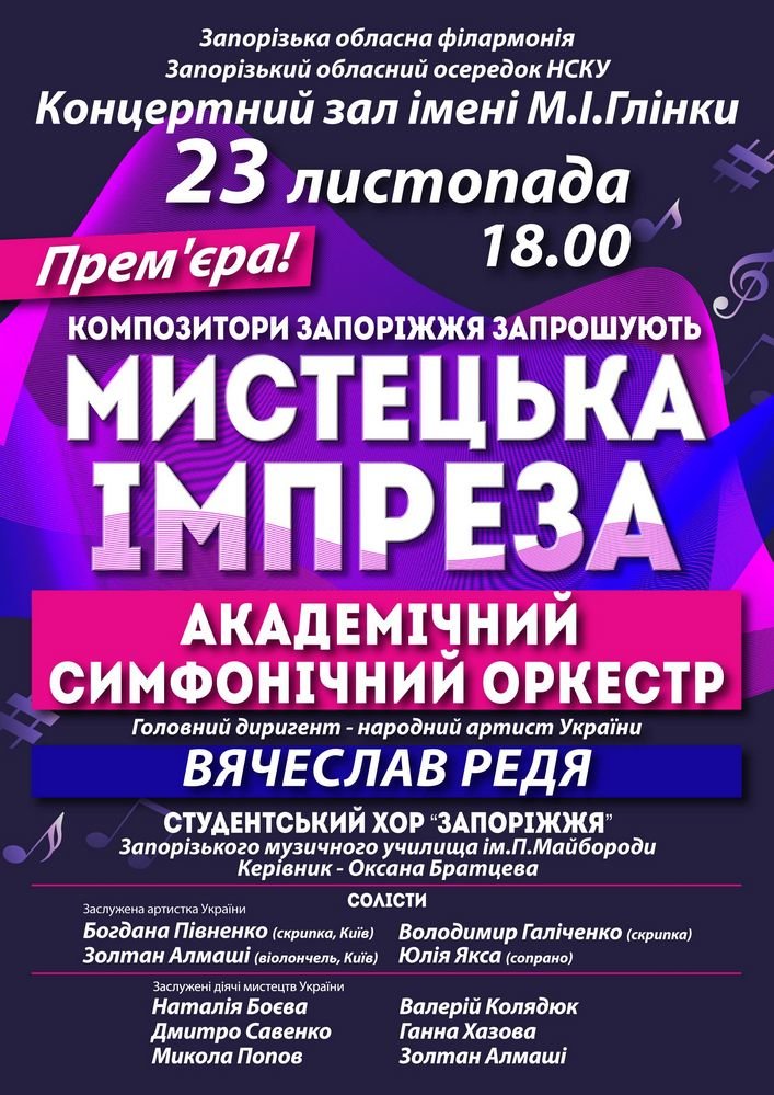29 листопада 2012 року є датою офіційної державної регістрації Запорізького обласного Осередку Національної Спілки композиторів України. Відтоді щорічно навесні у концертному залі ім. М. І. Глінки відбуваються музичні свята за участю академічного симфонічного оркестру Запорізької обласної філармонії під керуванням народного артиста України Вячеслава Реді. Оркестр виконує прем'єрні симфонічні твори запорізьких композиторів за участю провідних артистів та відомих музикантів України.