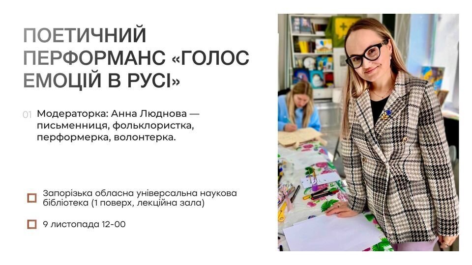 Анна Люднова – письменниця, фольклористка, перформерка, волонтерка. Засновниця фольклорної онлайн-студії «Витоки» для дітей та дорослих. Фасилітаторка письмових практик. Вивчає бібліотерапію за сертифікованою американською програмою, є членкинею Національної асоціації поетичної терапії (NAPT, USA) та редколегії The Jornal of Poetry Therapy.