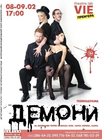 08-09 лютого у Запорізькому муніципальному театрі-лабораторії «Ві» відбудеться прем'єра вистави «Демони» (психологічна драма 18+) за мотивами творів Едварда Олбі та Ларса Норана. Початок вистави о 17:00.