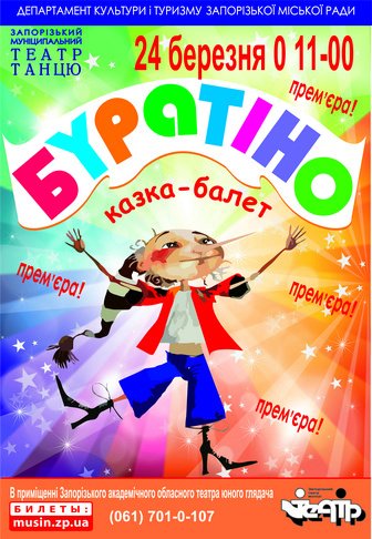 24 березня у Запорізькому академічному обласному театрі юного глядача відбудеться прем’єра казки-балету Запорізького муніципального театру танцю «Буратіно». Початок об 11:00.