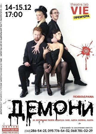 14-15 грудня у Запорізькому муніципальному театрі-лабораторії «Ві» відбудеться прем'єра вистави «Демони» (психологічна драма 18+) за мотивами творів Едварда Олбі та Ларса Норана. Початок вистави о 17:00.