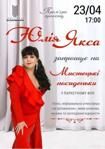 1 листопада у фойє філармонії відбудеться пілотна зустріч. Гостям запропонують смаколики, камерне освітлення й атмосферу щирості. Центральна фігура події — харизматична,талановита і багатогранна Юлія Якса, улюблениця справжніх поціновувачів вишуканого мистецтва.
