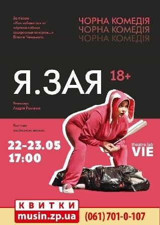 22-23 травня у Запорізькому муніципальному театрі-лабораторії «Ві» відбудеться вистава «Я. Зая» за твором В. Ченського «Как избавиться от мертвой собаки воскресным вечером».