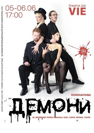 05-06 червня у Запорізькому муніципальному театрі-лабораторії «Ві» відбудеться вистава «Демони» (психологічна драма 18+) за мотивами творів Едварда Олбі та Ларса Норана. Початок вистави о 17:00.