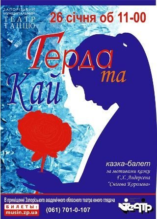 26 січня у Запорізькому академічному обласному театрі юного глядача відбудеться казка-балет Запорізького муніципального театру танцю «Герда та Кай» за мотивами твору Г.Х. Андерсена «Снігова королева». Початок вистави об 11:00.