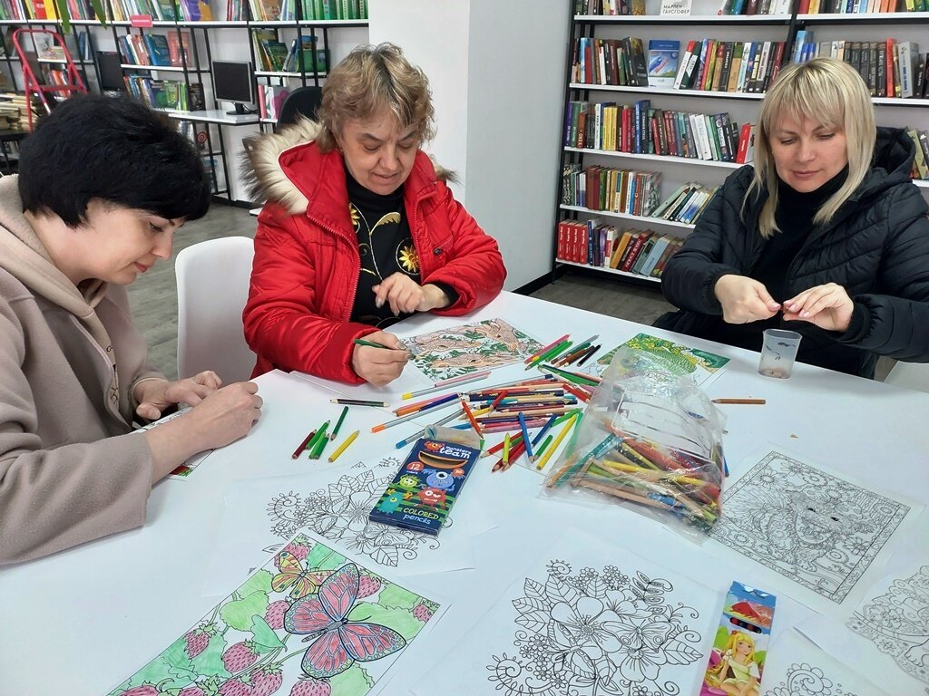 У дорослому відділі бібліотеки читачі отримали можливість розслабитися та відпочити, розмальовуючи антистресові розмальовки або просто читаючи в комфортній, спокійній атмосфері.