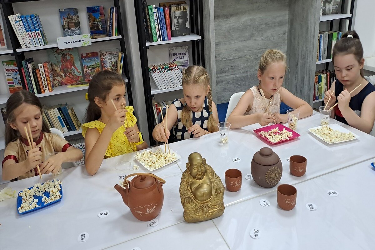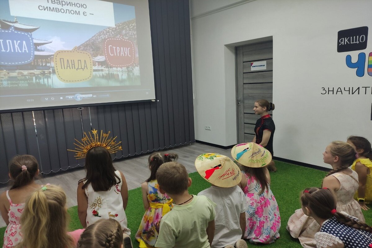 Гості бібліоняні на Ладозькій, 26 відправились за розгадками таємниць Піднебесної. Познайомившись з китайськими казками «Дівчина півонія», «Гора сонця», «Золота сопілка», малеча рушила в подорож. Перше відкриття – китайські цифри: діти дізналися, якими ієрогліфами вони позначаються. Разом з дівчиною Півонією вони розучили витончений і граціозний танок з віялами, занурившись в екзотичну, але таку умиротворену музику. Під керівництвом Пензлика Маляни дітлахи побудували Велику Китайську стіну і опанували мистецтво каліграфії симпатичними чорнилами – ото вже було справжнє диво, коли загадкові ієрогліфи почали проявлятися на фліп-чарті! Ще прикольніше було користуватися паличками для їжі: досвідчений майстер показав, як це робиться, і мандрівники радо змагалися між собою у вправності. Відвідали вони і Яна Мейцзи з казки «Золота сопілка», а представниця Запорізької федерації ушу Маргарита Зеленько продемонструвала показовий виступ з ушу таолу та дала урок бою з тінню маленьким подорожнім. Мандрівка до Китаю виявилася дуже цікавою і пізнавальною, але попереду малечу чекають нові пригоди і відкриття. Гайда з нами!