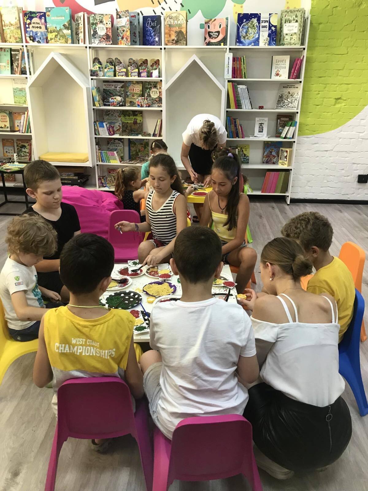 занурила дітей в «Абетку ремесел і професій» Надії Репети з чудовими ілюстраціями Мар’яни Петрів. Почитавши книжку, малеча рушила знайомитися з різного роду діяльністю, яка чекає їх в майбутньому. Ментальна розминка та відгадування загадок відкрило дітлахам величезний і неймовірно цікавий світ професій, а ігри та руханки допомогли долучитися до нього. Діти спробували себе в техніці кляксографії. Скринька з найрізноманітнішими інструментами та предметами змусила малюків пригадати все, що вони знають про їх призначення і використання. Наостанок - «на закуску»! - кожен спробував себе в ролі кондитера і зробив смачнюще тістечко з ягодами і кремом.