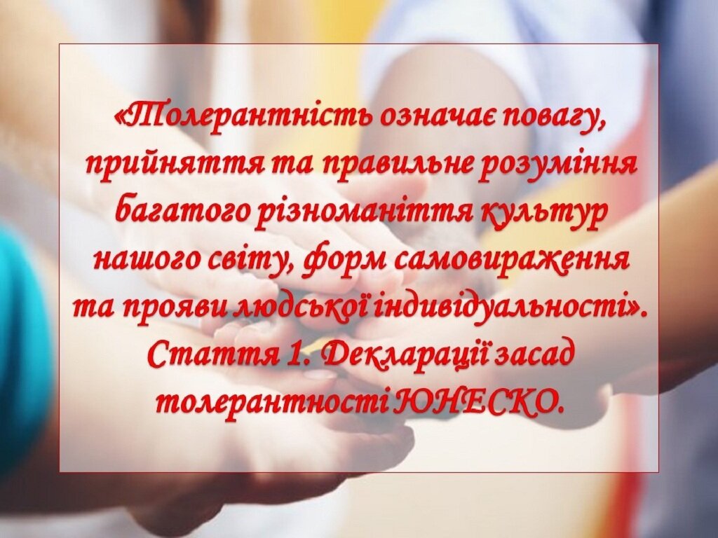 Міжнародний день толерантності — свято, яке відзначається 16 листопада в усьому світі, яке запровадили за рішенням ЮНЕСКО у 1995 році. Саме цього дня ухвалили Декларацію принципів терпимості. У ній йдеться про рівність усіх людей, незалежно від їхнього віросповідання, етносу або кольору шкіри. Ці принципи закріпили у Загальній декларації прав людини, що проголошує неприйняття усіх форм дискримінації, недопущення геноциду і покарання за нього.