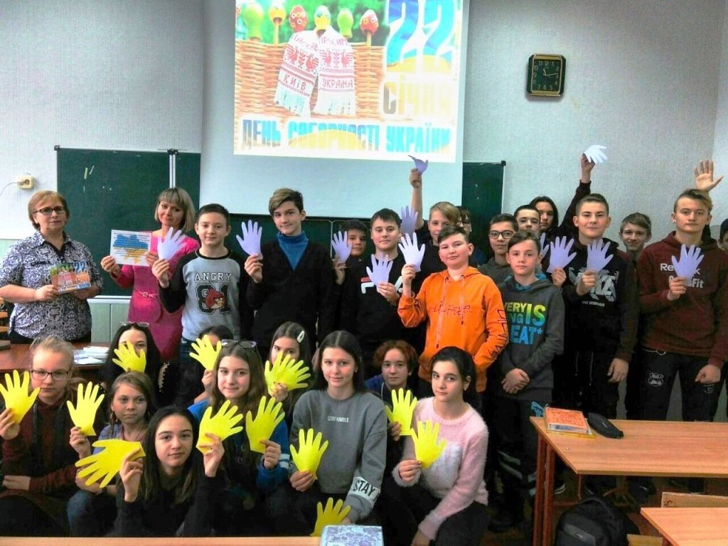 Із задоволенням учні взяли участь у флешмобі «Долоньки єднання», запропонованому бібліотекарями, та долучилися до фотоакції «Україна – це ми». Після цього всі перемістилися до шкільної бібліотеки, де відбувся історичний марафон-читання заради глибокої віри у гідне майбутнє рідного міста та України!