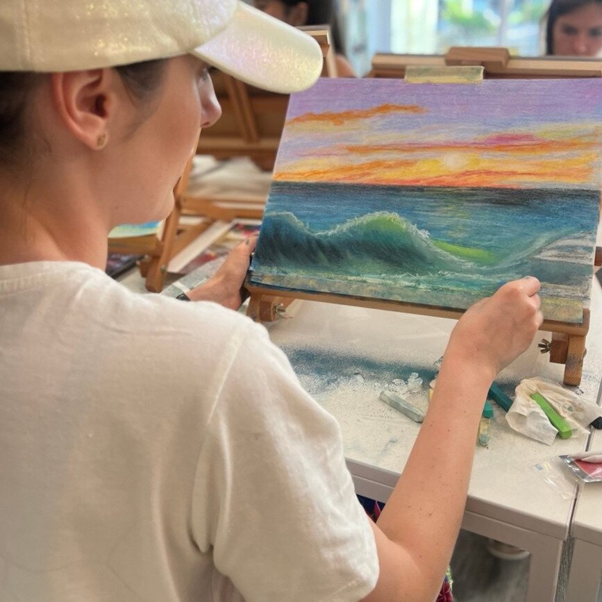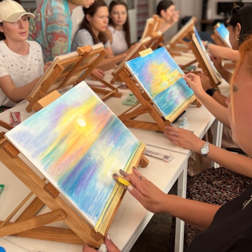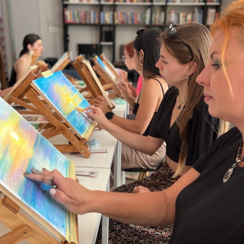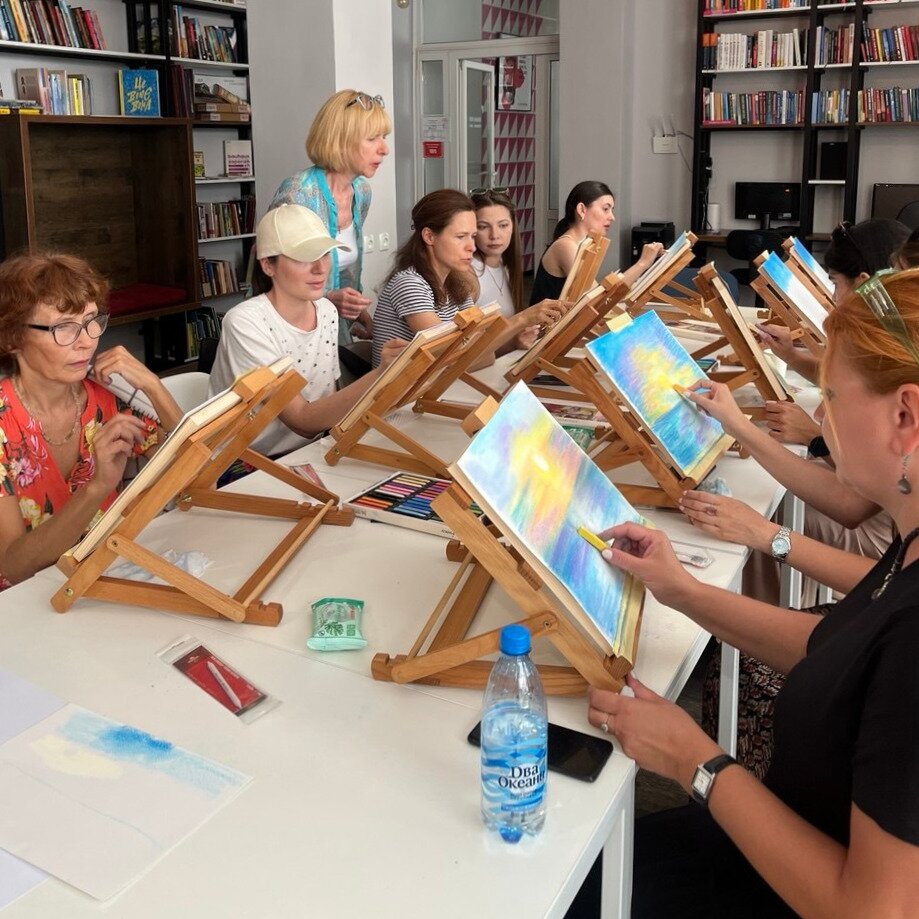 Під час заняття учасники ознайомилися з основами роботи з пастеллю, особливостями поєднання кольорів і створенням об’ємних фактур. Крок за кроком вони відтворювали морський краєвид – із глибиною горизонту, рухом хвиль і м’якими переходами світла.
