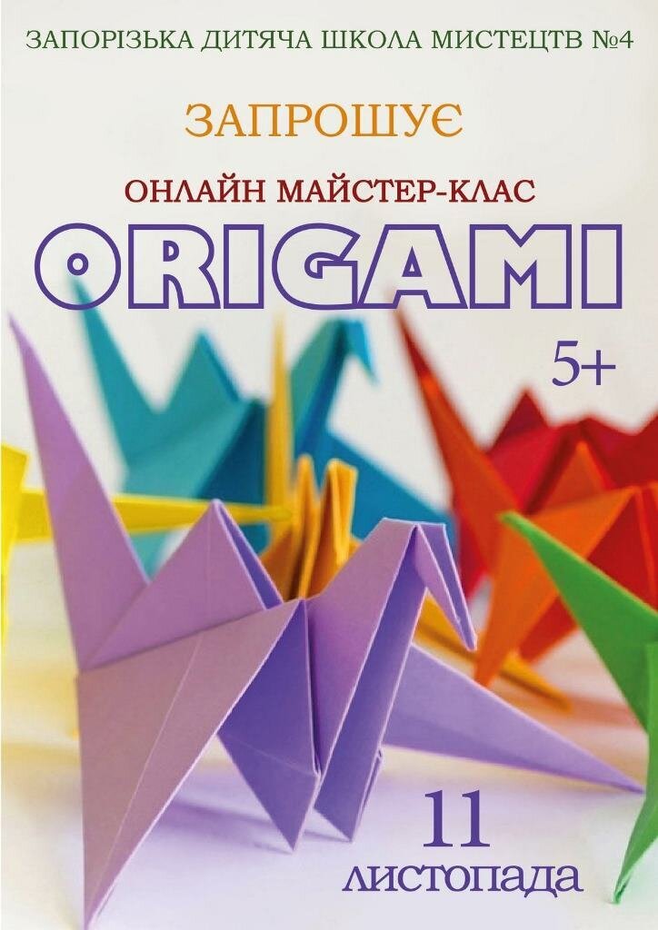 11 листопада для вихованців дитячої школи мистецтв №4, а також усіх поціновувачів одного з різновидів декоративно-прикладного мистецтва – орігамі, відбудеться онлайн майстер-клас. Долучитися можна за наступним посиланням: (http://surl.li/aqoll).