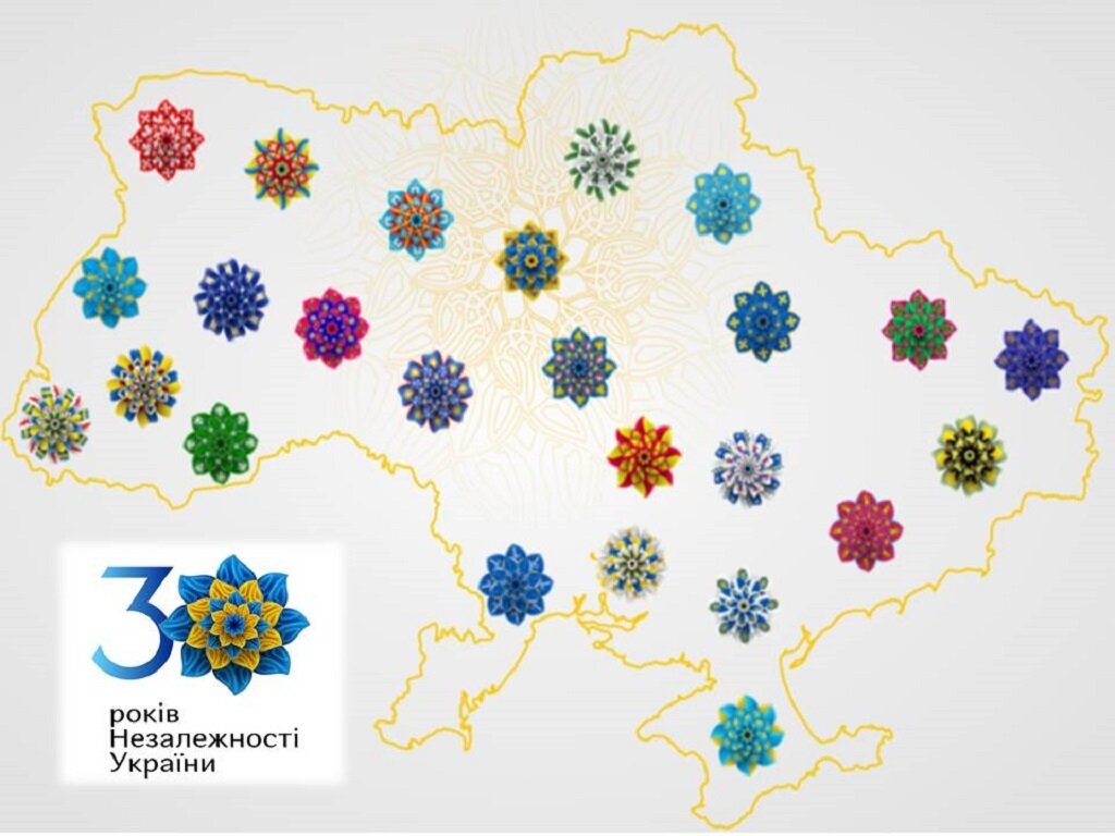 30-ліття Незалежності України — загальнонаціональна подія. До Дня Незалежності за координації Міністерства культури та інформаційної політики України була підготовлена концепція єдиної візуальної символіки свята. В її основі покладена ідея бачення незалежності як мрії, досягнення якої прагнули багато поколінь українців. Зазначається, що графічна візуалізація комплексу образів реалізована у вигляді калейдоскопічних квіткових орнаментів, які формуються із зображень, фотографій, символів, та стають основою динамічної айдентики, що розквітає, як сама країна. "Ти у мене єдина" – основний лейтмотив проєкту. Цей слоган, який є певним універсальним зверненням до країни, квітки, незалежності, нації. Кожна область України має свою унікальну квітку-логотип з графічними елементами та кольоровою гамою прапорів цього регіону.