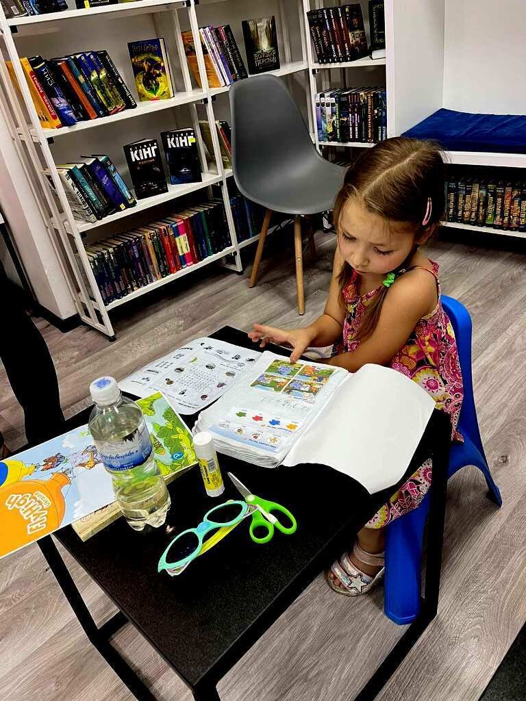 У бібліотеці за адресою пр. Моторобудівників, 64 розпоча новий "навчальний рік" проєкт «English на подушках». Діти розкладають пенали, зошити, хтось уже за столом чекає початку заняття. Пані Катерина Дромашко готується до заняття: порпається у паперах, шукає в комп’ютері пісеньки та ігри, налаштовує проєктор. На екрані з’явився жук-сонечко, який несе помаранчеву паперову хмаринку з основним правилом: «Слухаємо, коли хтось говорить».
