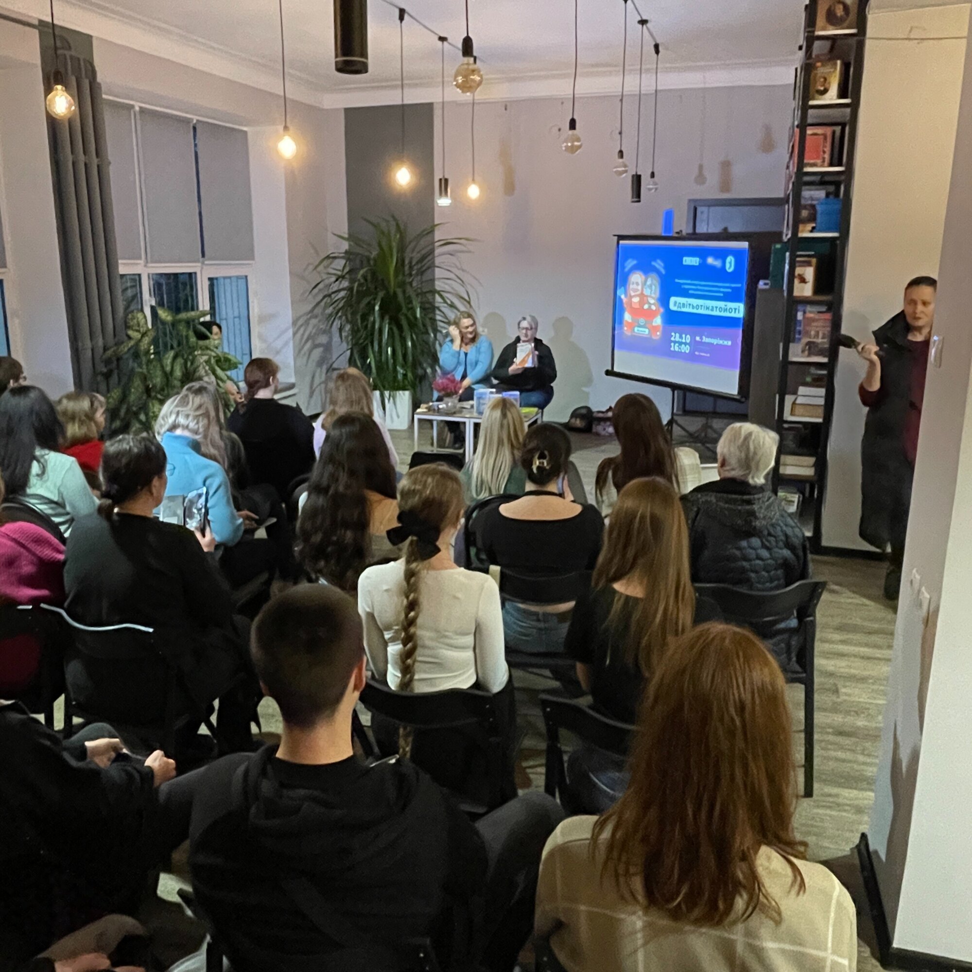 Також гості презентували твори військових авторів і розповіли про мандрівний літературно-волонтерський проєкт #двітьотінатойоті, що підтримує українських митців і захисників.