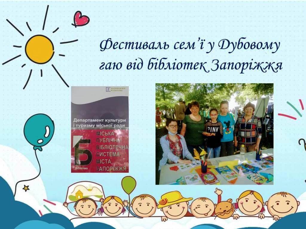 19 червня бібліотека Комунарського району (вул. Комарова, 9) взяла участь у загальноміському заході «Фестиваль сім’ї», який проходив на території Центрального парку культури і відпочинку «Дубовий гай».