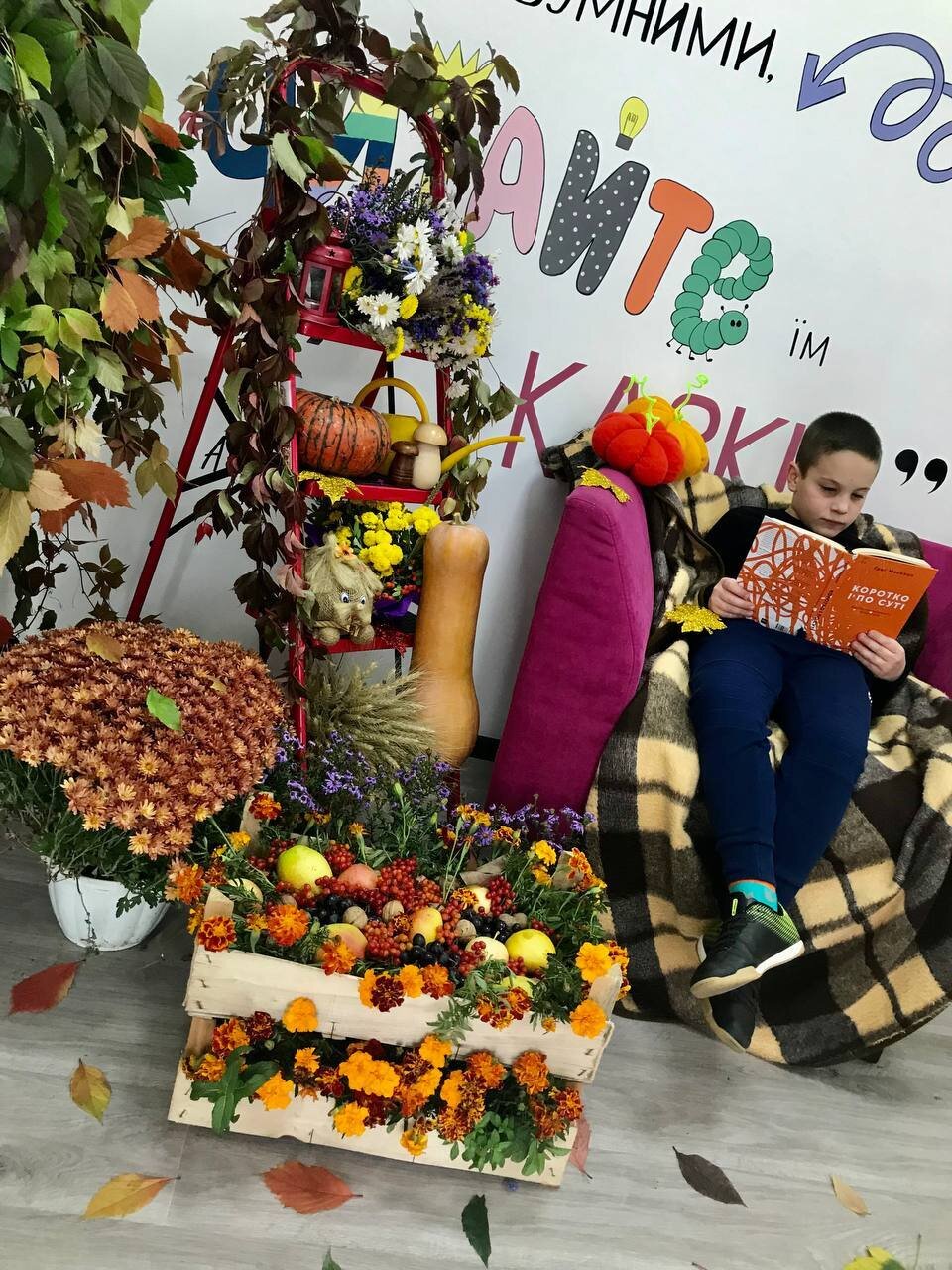 На дворі хмарно і прохолодно, а на бібліоняні панувала тепла, доброзичлива атмосфера. Нашу фотозону прикрасили красиві декорації: куди не подивися скрізь дари осені: тут і овочі, і фрукти, і гриби з ягодами, а під ногами було розкидане різнокольорове листя. Читачі із задоволенням розповідали вірші, співали пісні, грали у різні ігри. По завершенню щедра