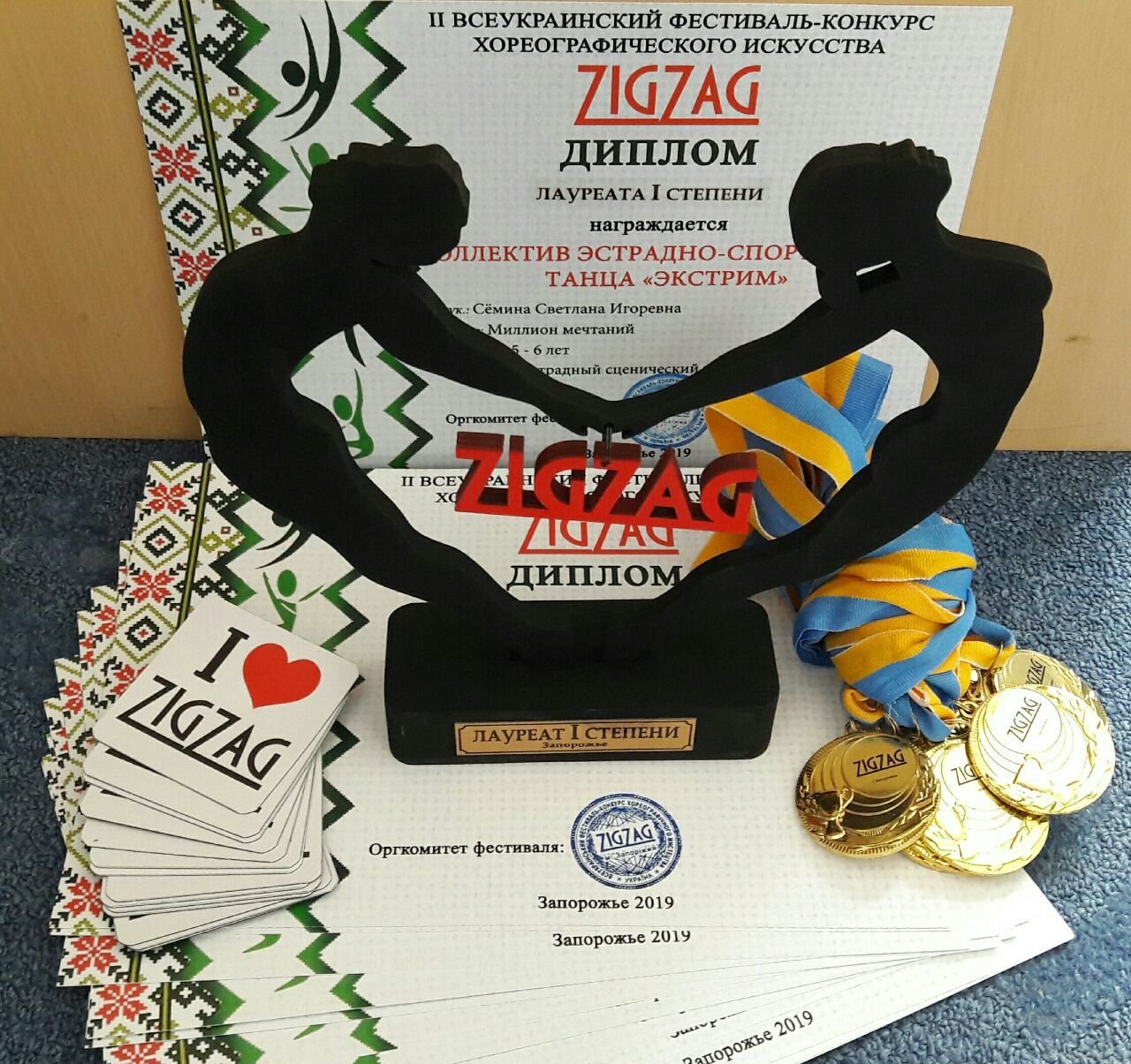 04 травня у місті Запоріжжі відбувся II Всеукраїнський фестиваль-конкурс хореографічного мистецтва «ZigZag». За результатами фестивалю колектив естрадно-спортивного танцю «ЕКСТРИМ» (керівник Сьоміна С.І.) палацу культури «Заводський» здобув звання лауреата 1 ступеня у номінації «Естрадний сценічний танець», категорія 5-6 років.