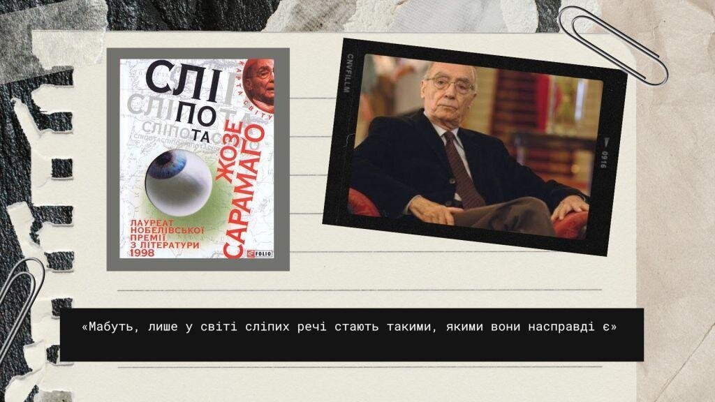 Історія про те, як в одному безіменному мегаполісі люди раптом всі осліпли, крім однієї жінки, і до чого це призвело. Саме репліками цієї жінки читачам відкривається весь той жах, який з'явився внаслідок несподіваних раптових втрат зору. Після прочитання цієї книги, за визнанням численних читачів, хочеться дивитися на світ широко відкритими очима і просто — жити. Тому що нічого важливішого за це й бути не може.