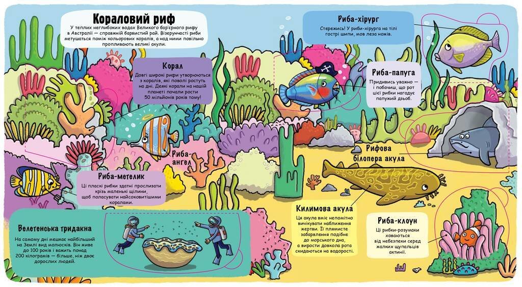 Тож пропонуємо вам, поринути разом з нами у таємничий підводний світ, познайомитись з дивовижними істотами, що живуть в океанських глибинах; дізнатися цікаві факти про те, коли з`явилися медузи, хто пережив динозаврів, як влаштоване життя на кораловому рифі, про войовничу рибу-меч і чому рибі-клоуну не страшні актинії.