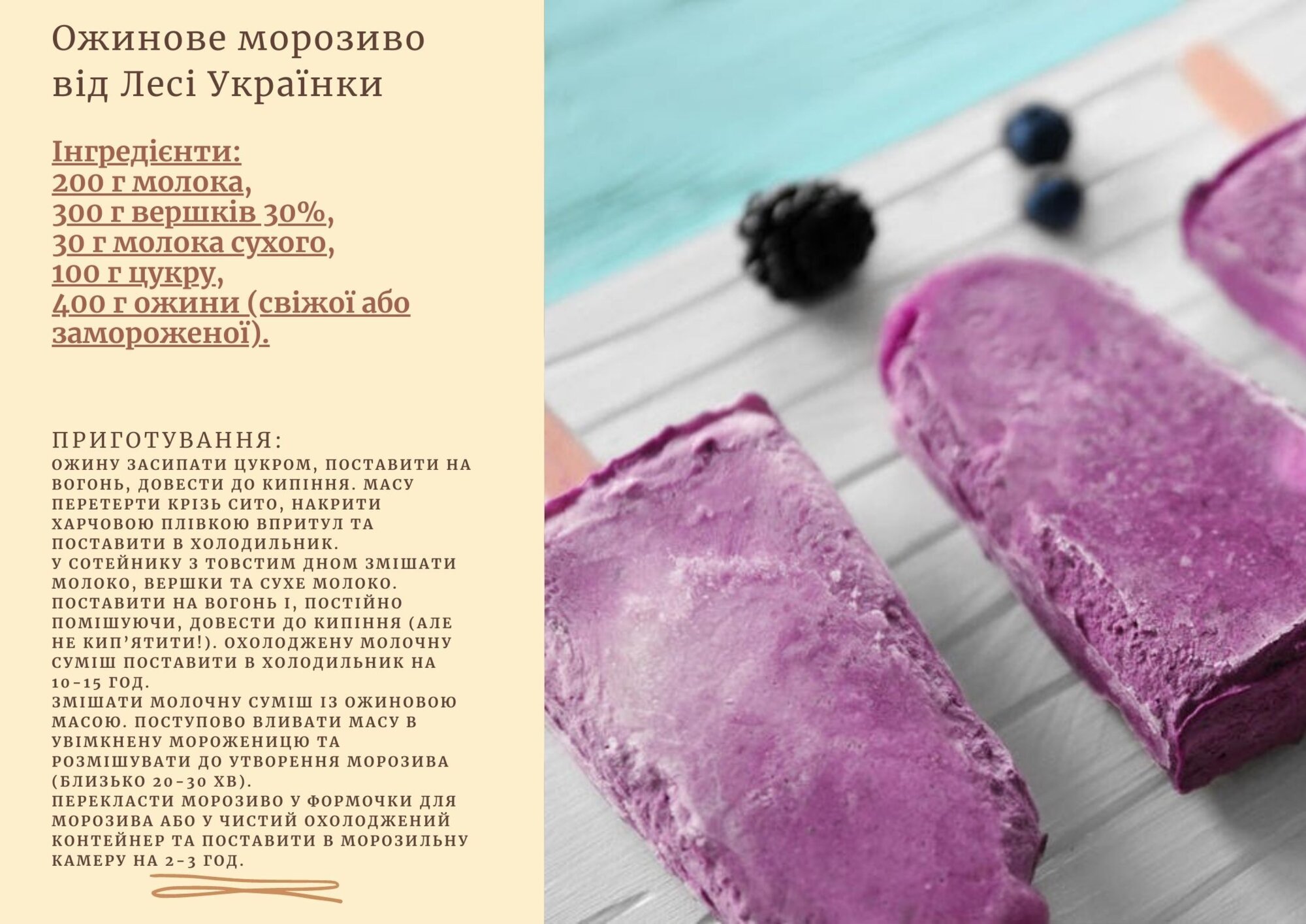 Морозиво також було одним з улюблених десертів у родині Косачів. Зі спогадів Ізидори відомо, що в останні три дні свого життя Леся могла їсти лише «морозиво з ожини. На щастя, навколо в горах було багато ожини. Я збирала її і робила Лесі морозиво».