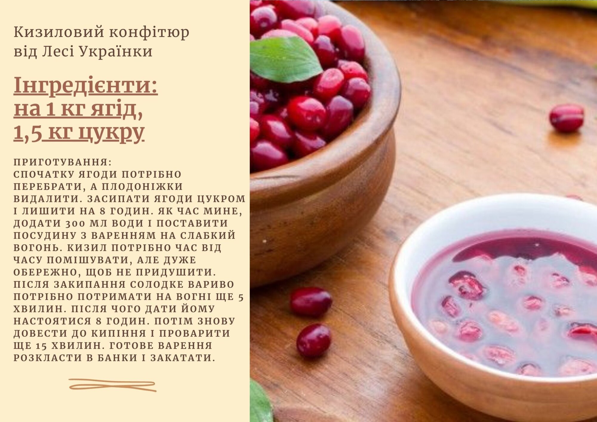 Вранці Леся надавала перевагу каві з вершками. З однієї з поїздок до Кавказу вона привезла декілька кущів кизилу і посадила їх в своїй дворянській садибі, що в селі Колодяжне на Волині. Кущі не просто прийнялися, вони ще й почали давати рясні плоди, з яких поетеса готувала надзвичайно чудове варення. Цікаво, що Лесин кизил плодоносить до цих пір, однак, тепер варення з нього варять співробітники музею.