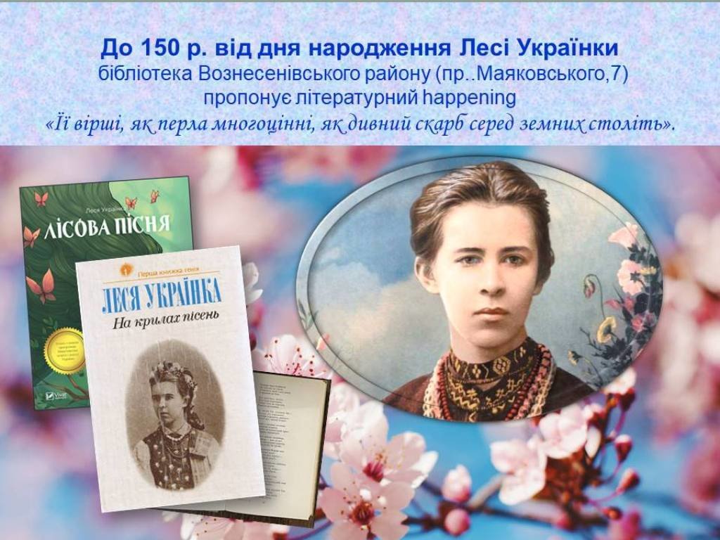 В день народження Лесі Українки (25 лютого) запрошуємо усіх охочих, а також поціновувачів її творчості до бібліотеки Вознесенівського району, яка розташована за адресою: проспект Маяковського,7.