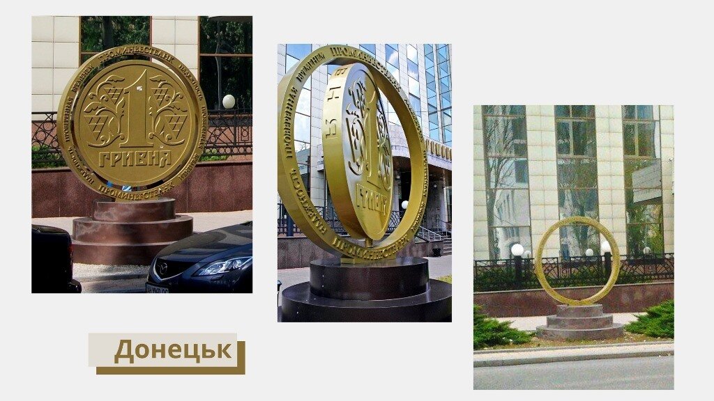 Перший пам’ятник вітчизняній гривні встановили в Донецьку у 2005 році біля відділення «Промінвестбанку» в центрі міста. Оригінальний монумент було виконано у формі монети з нержавіючої сталі на ступінчастому п’єдесталі, що оточена золотим ореолом, який символізує її основу й стабільність. Монета оберталася навколо вертикальної осі. У 2015 році гривня зникла, залишились тільки постамент і ореол.