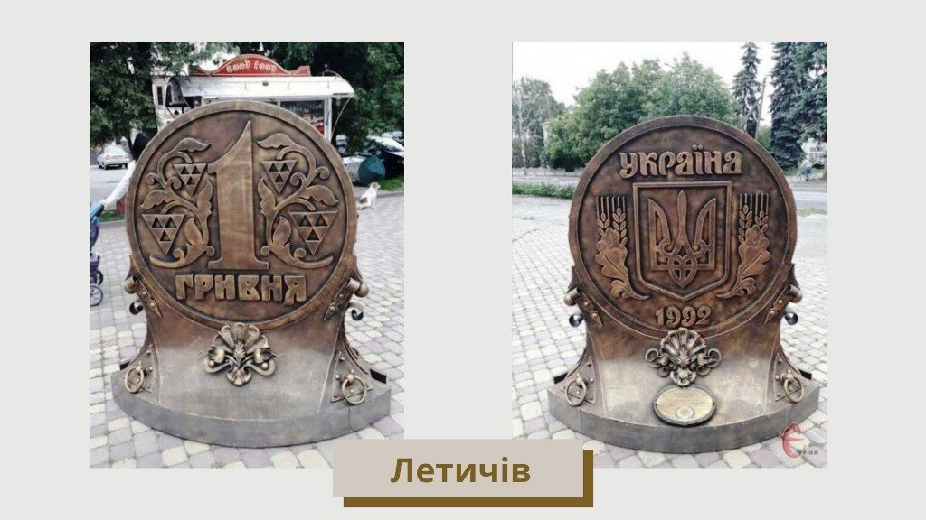 В центрі Летичева, що у Хмельницькій області, встановлено гігантський пам’ятний знак «Гривня», який є символом міцної української економіки, розквіту та достатку. Втілив у життя цю прекрасну ідею Андрій Кучер – коваль, майстер декоративно-прикладного мистецтва.