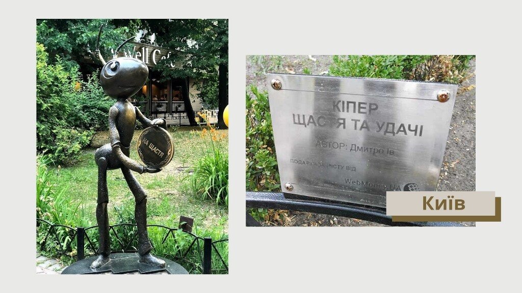 Бронзовий мураха з монетою висотою два метри, вагою 200 кілограм. З одного боку монети, яку можна обертати навколо вертикальної осі, напис «На щастя», з іншого – «На удачу». Арт-об'єкт називається «Кіпер щастя і удачі». А Мураха її символ. Автор твору – відомий український скульптор Дмитро Ів – уродженець Запоріжжя.