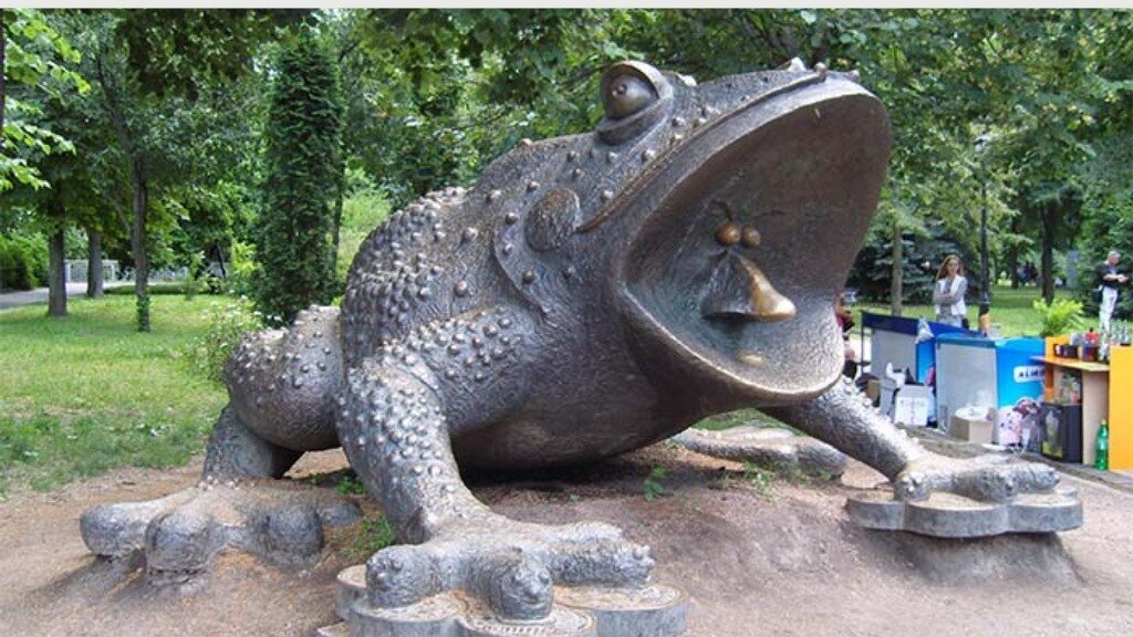 Монети різних країн світу тримає під своїми лапами величезна бронзова жаба- скарбничка, яка має ще обличчя в роті. Існує повір'я, що вона виконує бажання. Щоб залучити в своє життя достаток, потрібно потерти ніс в роті жаби і кинути монетку в проріз у роті. Пам'ятник займає площу 4 квадратних метри і важить більше 6 тонн. Подарував її Києву відомий український скульптор Олег Пінчук. На думку автора бронзова жаба буде стояти століттями, як символ успіху, грошей, багатства і процвітання міста.