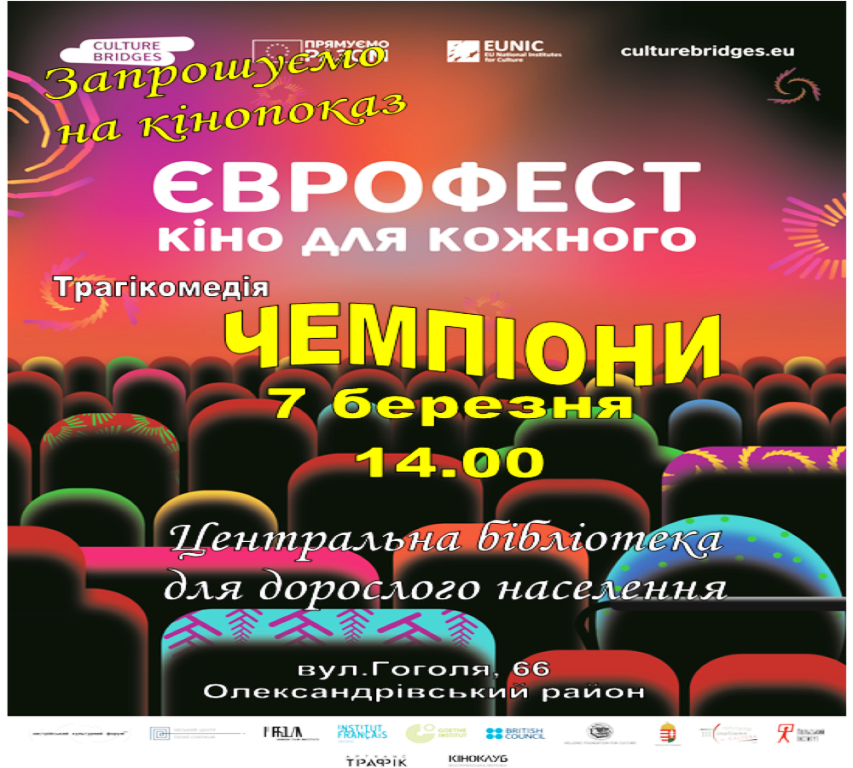 Бібліотека приєдналася до кінофестивалю європейських фільмів в рамках проекту «Кіноклуб. Всеукраїнська мережа». Показ фільмів організовано компанією «Артхаус Трафік» за підтримки програми Сulture Bridges, яка фінансується Європейським Союзом в межах впровадження Угоди про асоціацію між Україною та ЄС, та здійснюється Британською Радою в Україні у партнерстві з EUNIC – Мережею національних інститутів культури Європейського Союзу.