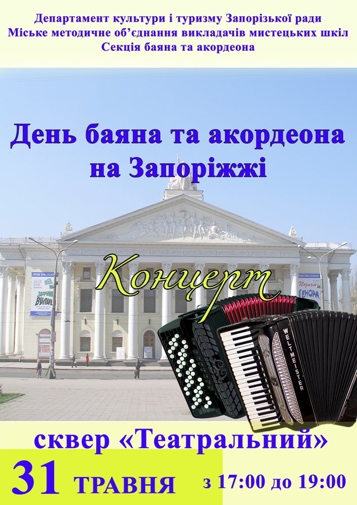31 травня з 17:00 до 19:00 у сквері «Театральний» (Олександрівський район) відбудеться святковий концерт «День баяна та акордеона на Запоріжжі».