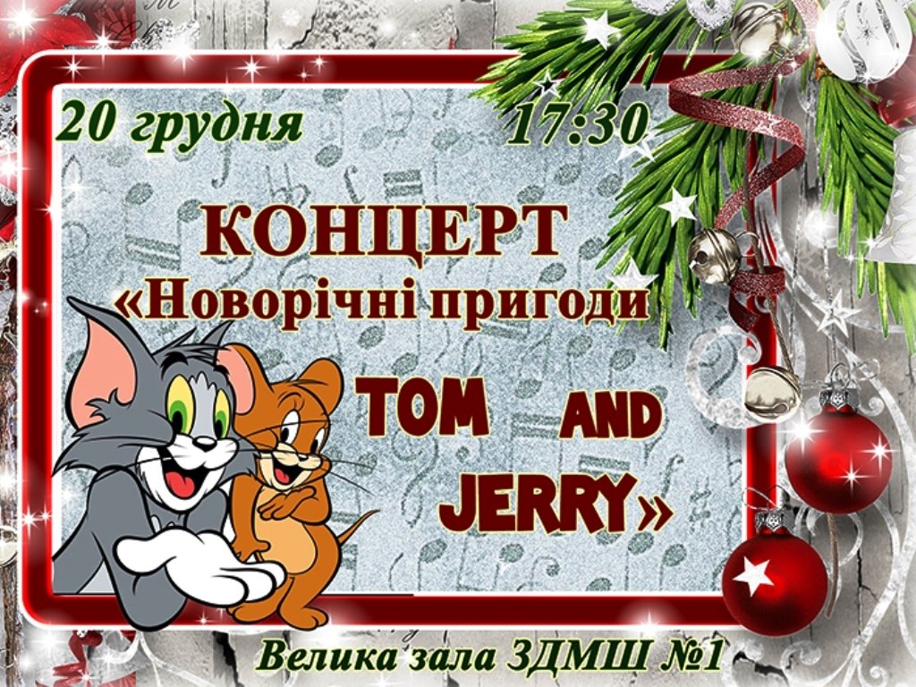 Дитяча музична школа № 1 (вул. Гоголя, 47) запрошує всіх 20 грудня о 17:30 на театралізований концерт «Новорічні пригоди Тома і Джері», де ми разом зможемо відправитися у цікаву подорож, познайомитись з казковими героями, потрапити у незвичайні пригоди, зустріти улюблених героїв і, нарешті, знайти Новорічну Ялинку! Чекаємо на вас і гарантуємо чудовий новорічний настрій! Вхід вільний.