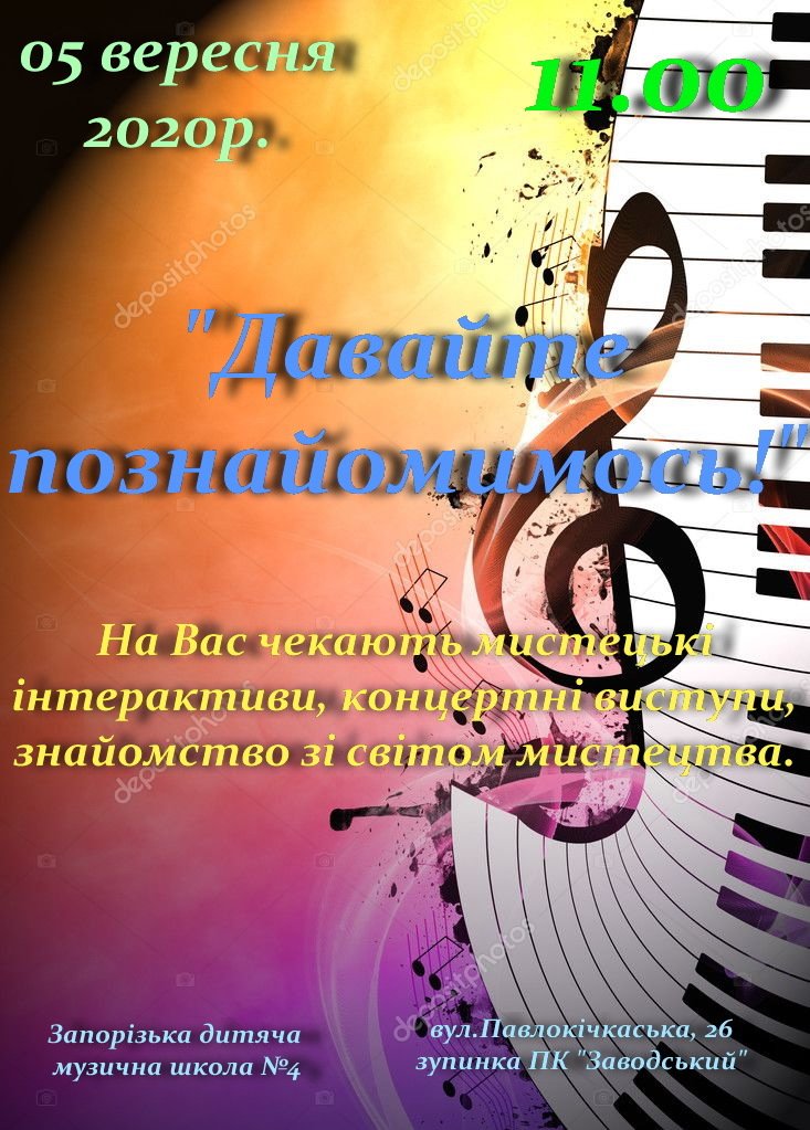 5 вересня 2020 року об 11:00 на подвір’ї дитячої музичної школи №4, яка розташована за адресою: вул. Павлокічкаська, 26 усі бажаючі можуть познайомитись: