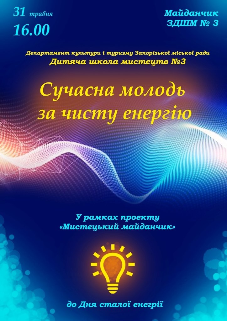 31 травня о 16:00 у рамках проекту дитячої школи мистецтв № 3 «Мистецьке подвір’я» відбудеться мистецька акція, присвячена Дням сталої енергії у Запоріжжі 2019 під гаслом - сучасна молодь - за чисту енергію.
