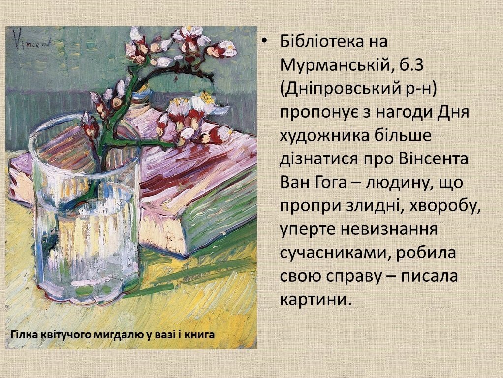 З нагоди Дня художника, бібліотека по вулиці Мурманська,3 (Дніпровський район) пропонує більше дізнатися про Вінсента Ван Гога – людину, що попри злидні, хворобу, уперте невизнання сучасниками, робила свою справу – писала картини.