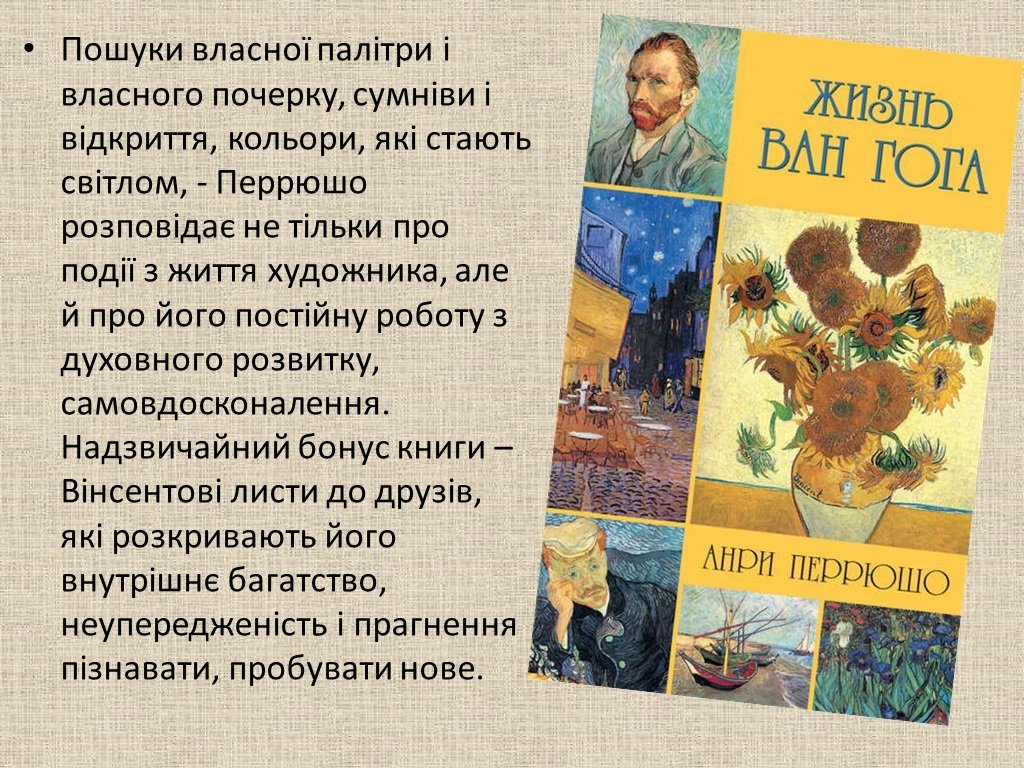 Ще одна художня біографія митця, яка спирається на документи, листи, але написана не сухою мовою достовірності, а захоплююче, хвилююче, проникливо і переконливо. Пошуки власної палітри і власного почерку, сумніви і відкриття, кольори, які стають світлом, - Перрюшо розповідає не тільки про події з життя художника, але й про його постійну роботу з духовного розвитку, самовдосконалення. Надзвичайний бонус книги – Вінсентові листи до друзів, які розкривають його внутрішнє багатство, неупередженість і прагнення пізнавати, пробувати нове.