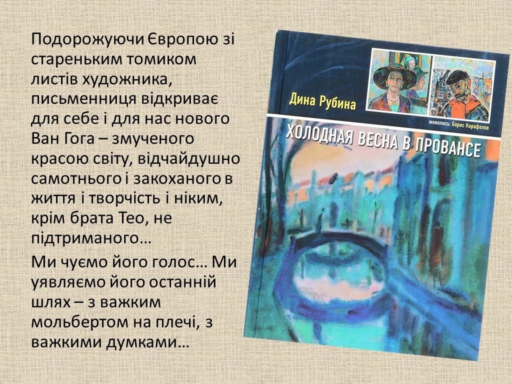 Разом з нею ми чуємо його голос, уявляємо його останній шлях – з важким мольбертом на плечі, з важкими думками.