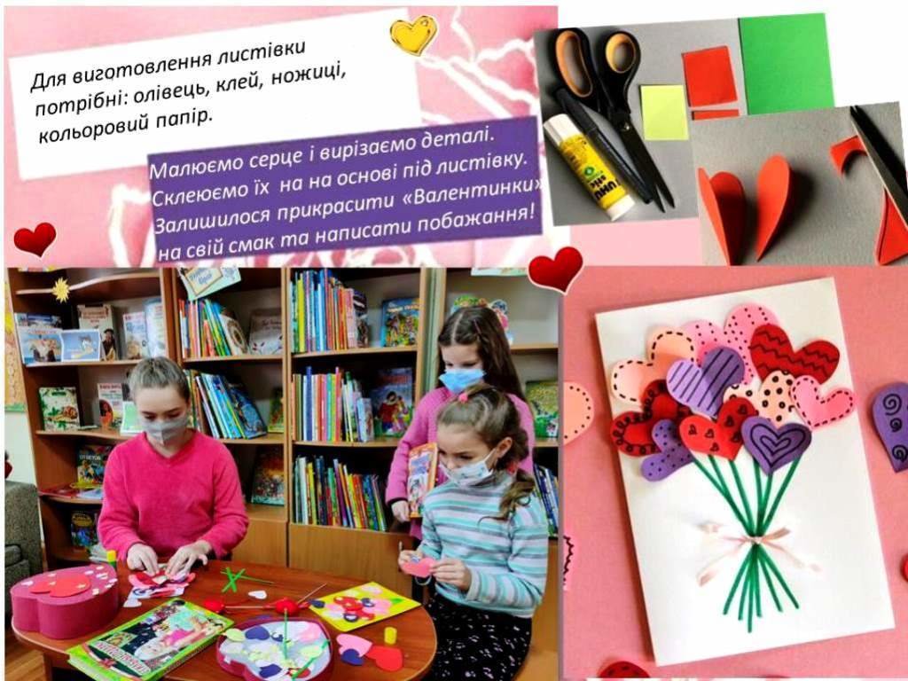 Перші чорно-білі листівки стали випускати на початку 1800-х років, зовсім скоро вони набули популярності і вийшли в масовий тираж. Але не дивлячись на великий асортимент валентинок, найкращими завжди вважалися, зроблені своїми руками. Тому напередодні свята бібліотека Комунарського району (вул. Новокузнецька, 4) пропонує всім бажаючим до Дня Святого Валентина виготовити об’ємну вітальну листівку власноруч.