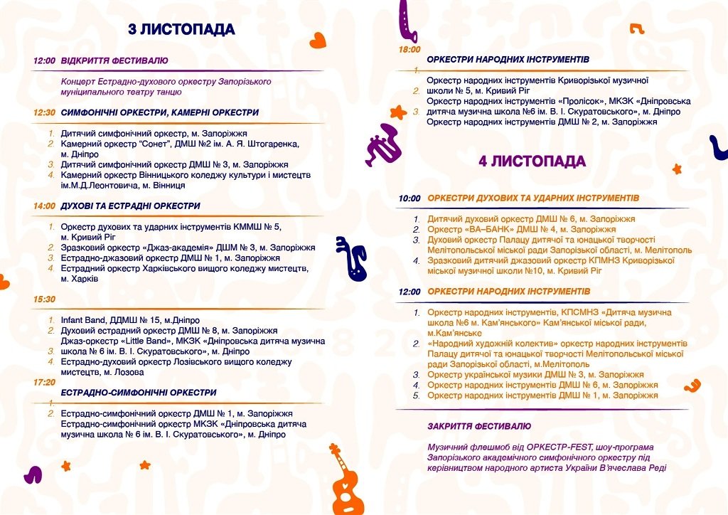 Організатори фестивалю «ОРКЕСТР-FEST» – департамент культури і туризму Запорізької міської ради спільно з Запорізькою дитячою філармонією за підтримки Українського культурного фонду. Протягом двох днів у палаці спорту «Юність» виступлять симфонічні, камерні, духові та естрадні оркестри, а також оркестри народних інструментів – більше 25 колективів із Запоріжжя та інших регіонів України. Завершить фестиваль спільний музичний флешмоб під керівництвом народного артиста України В’ячеслава Реді.