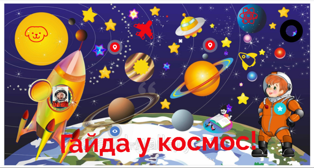 За інтерактивними мітками, бібліотекарі «заховали» пізнавальну інформацію про неосяжний всесвіт і космічні апарати, документальні кадри польоту Гагаріна і розповідь про українського космонавта Леоніда Каденюка.