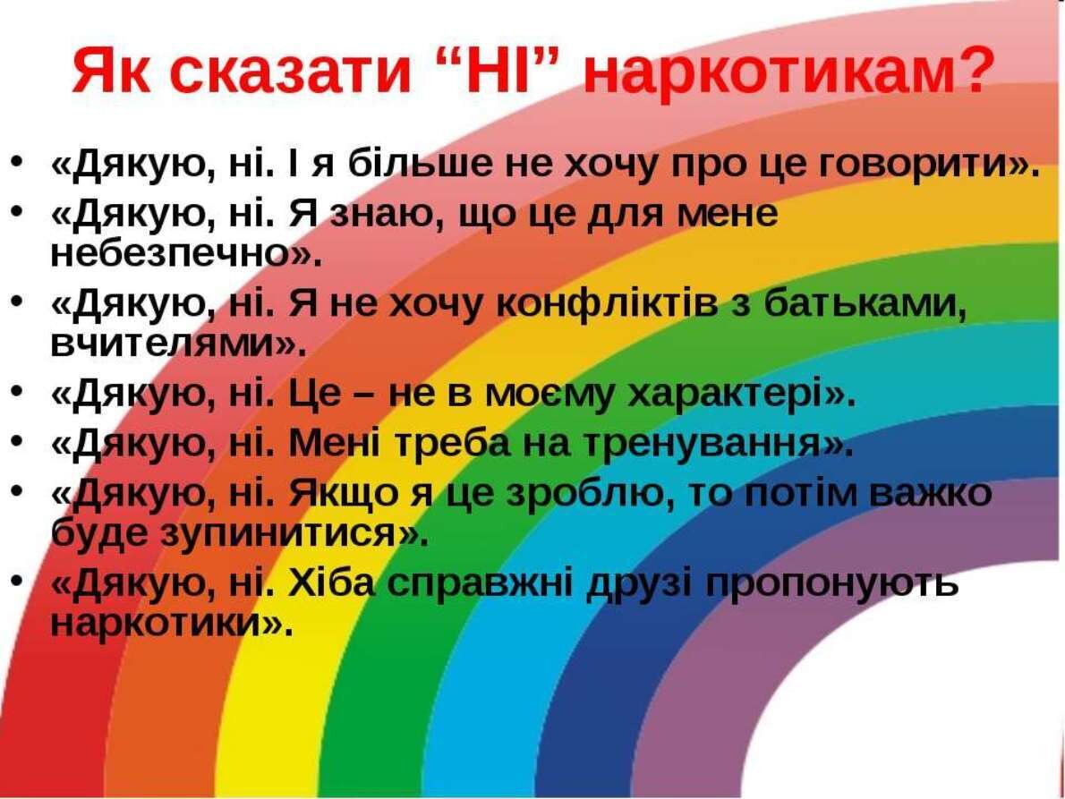 Зробіть одне-єдине зусилля – не піддайтеся спокусі легковажного «знайомства» з наркотичною речовиною! Пам’ятайте, це отрута і неминуча смерть! Скажіть категоричне «Ні!» добровільному безумству.
