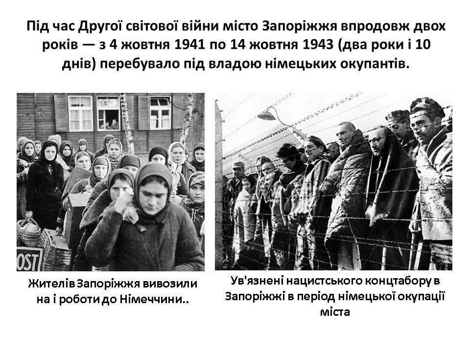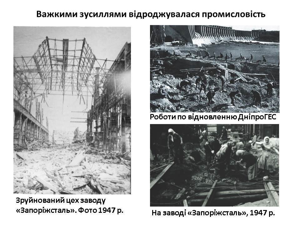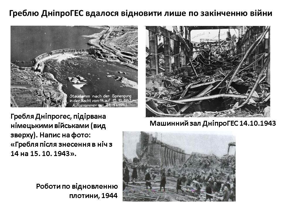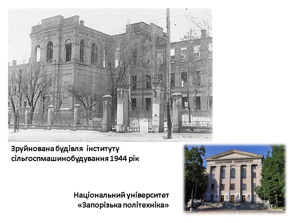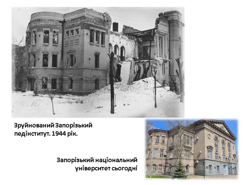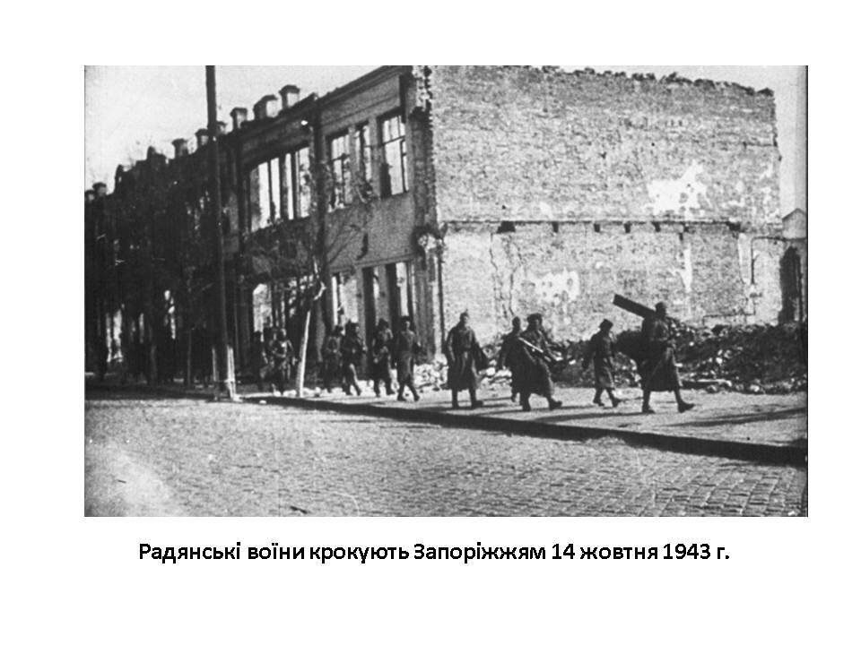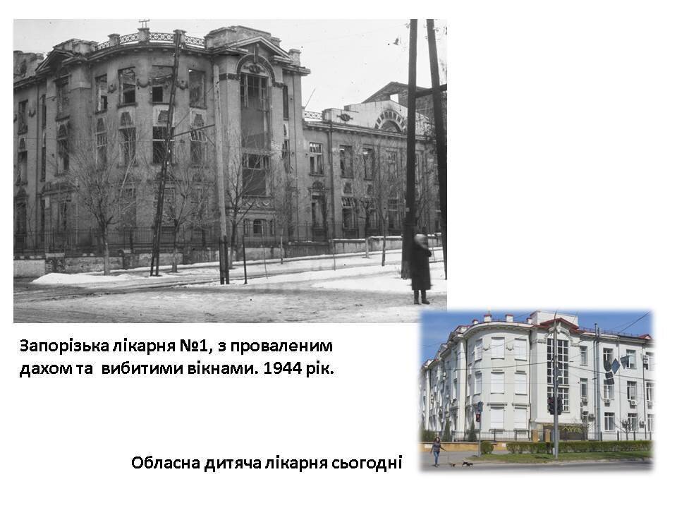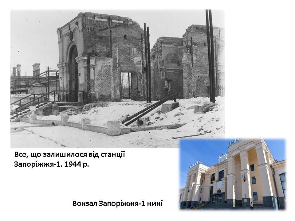 Запоріжжя після визволення значно відрізнялося від знайомого нам вигляду. Більша частина всіх житлових будівель міста була зруйнована, виведені з ладу комунальні підприємства не працювали, не було світла та води. Промислові споруди «являли собою хаотичні нагромадження з металу, бетону та цегли».