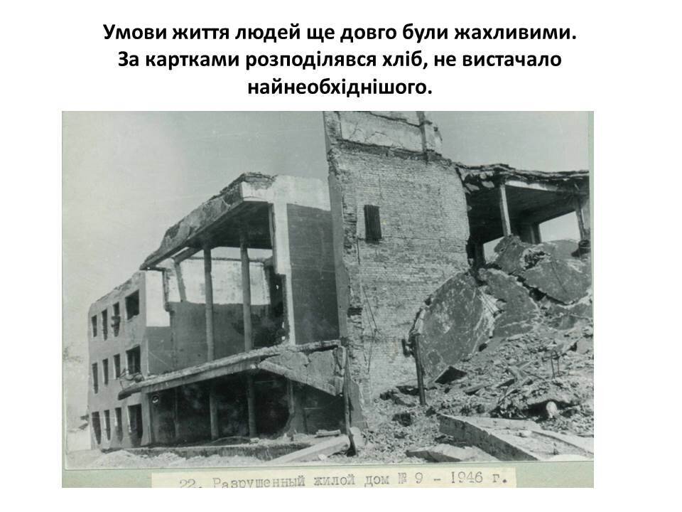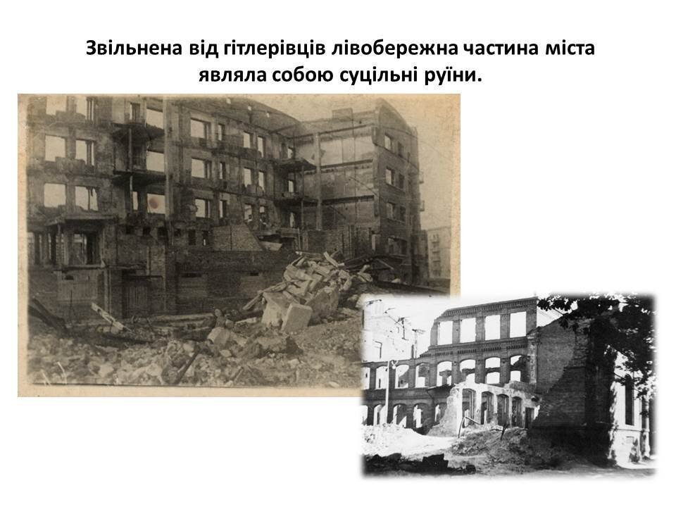 З книг та історичних джерел відомо, що після окупації в місті залишилося близько 60 тисяч городян, і «основний тягар перших відновлювальних робіт у місті ліг на плечі жінок та підлітків». Жахливі наслідки війни ліквідовувалися ще довгі роки.