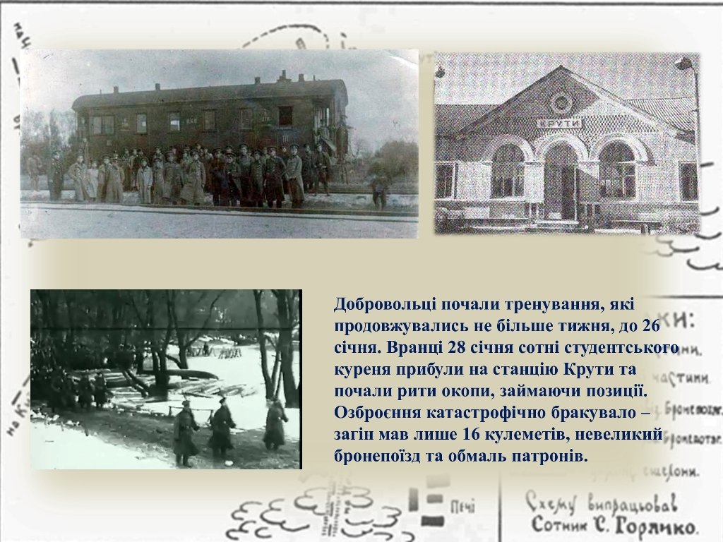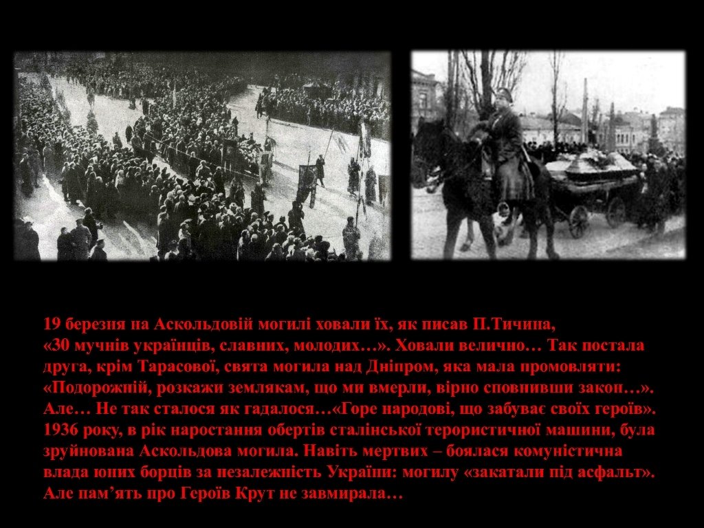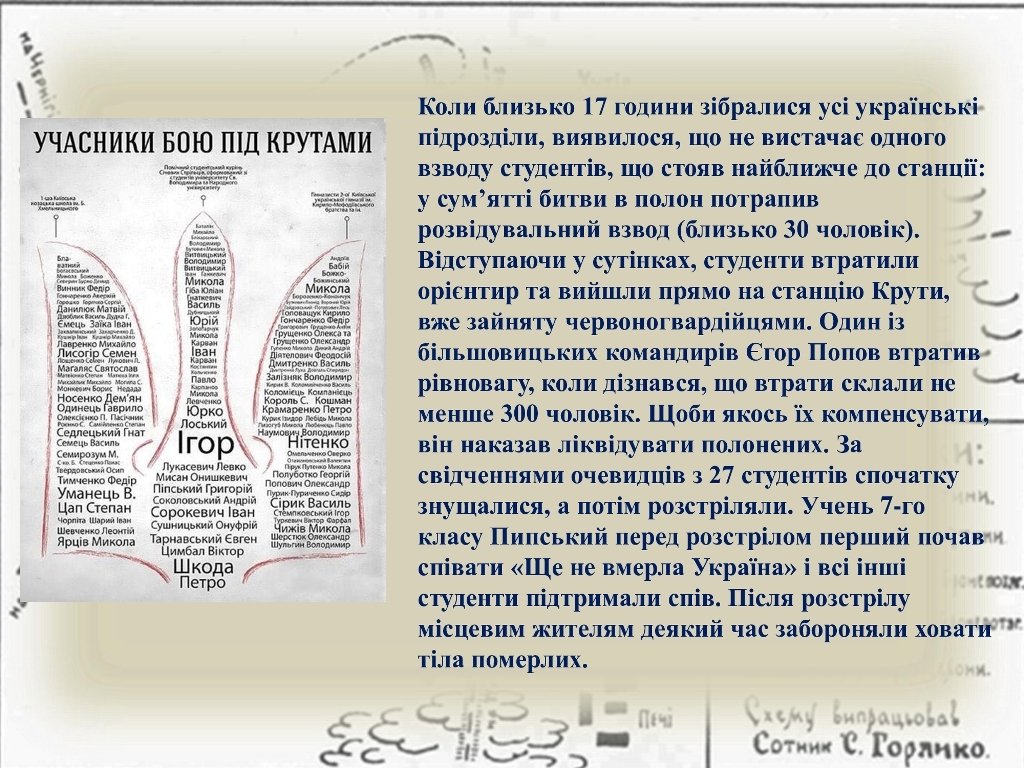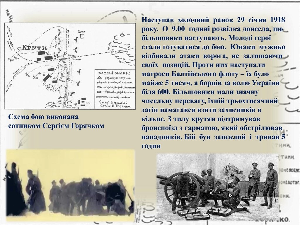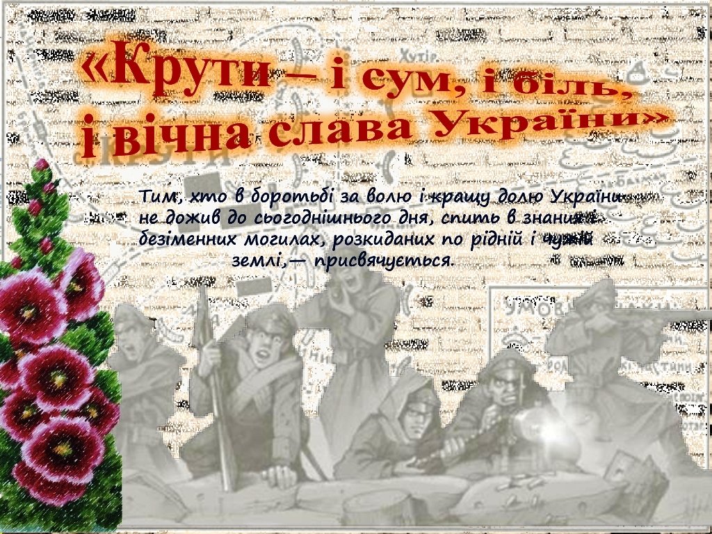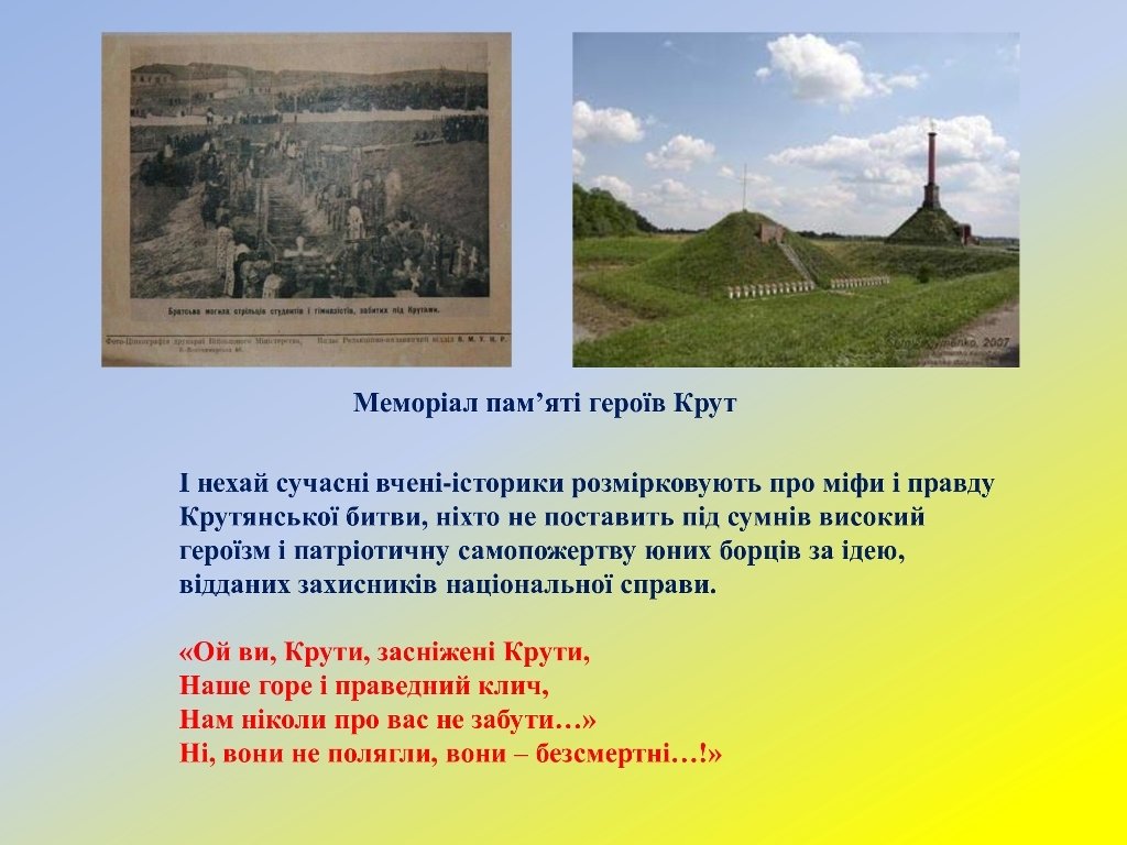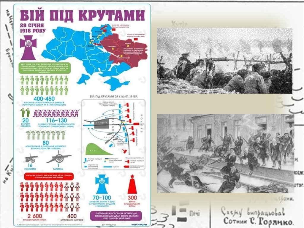 Своє право бути вільною, незалежною державою українці відстоювали впродовж багатьох століть. 103 роки тому у нерівний бій з чотиритисячним підрозділом російської Червоної гвардії вступив нечисленний загін із юних оборонців української державності. Бій відбувся на залізничній станції «Крути» в сучасній Чернігівській області, за 130 кілометрів від Києва. Тривав він понад п'ять годин. Під час бою близько 30 хлопців потрапили в полон до більшовиків і були жорстоко страчені. Ці події назавжди вкарбувалися в пам’ять поколінь українців. Адже під Крутами творилася історія молодої, як і бійці-крутяни, держави. Держави, яка ціною неймовірних зусиль та трагічних втрат заявила про своє право бути вільною від ярма російської імперії. Вшановуючи пам’ять захисників Української Народної Республіки, щороку, 29 січня, ми відзначаємо День пам’яті Героїв Крут.